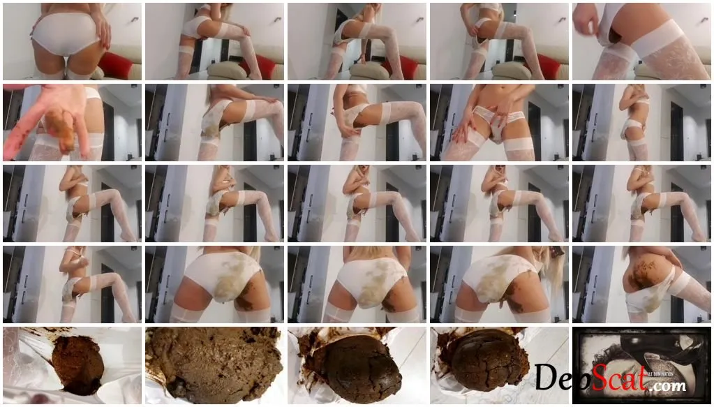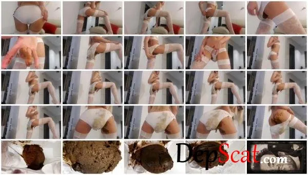 Looking sexy in my lacy white satin panties and stockings, I'm as horny as hell. I can't wait to for my fingers to start working their magic on my clit. But making me hornier still is that I plan to fill my panties with a huge poop while I play with myself. But I don't plan to stop there. Once my panties are fully loaded I'm gonna keep on going - rubbing my pussy, teasing my clit and touching my nipples. This is how dirty horny bratty girls get themselves off - shit themselves and then masturbate like crazy til they cum!