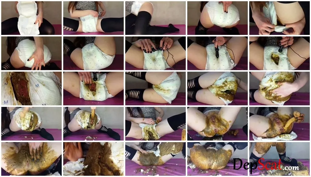I usually rarely use diapers when I play because I like to watch shit come out of me. However, the diaper gives me the pleasure of feeling hot shit longer, it is a wonderful feeling… Before the game, I remove the top layer from the diaper so that it is better to see what’s inside but smeared my hands with blue paint while putting on the diaper, so I’m a fucking Smurf at the beginning of the video. I want to ruin this diaper so I piss and shit inside a lot, knead the shit and rub my pussy through the diaper, make a holes in the diaper and fuck my pussy and ass with a vibro toy through a shitty holes. The diaper is not spoiled enough so I lubricate my dildo and fuck my pussy and ass again while the pieces of the absorbent layer fall to the floor. Then I take off my diaper and fuck my holes with a toy again, wipe my ass and pussy with a diaper, smear my shit. Done! My diaper is ruined and I enjoyed it…