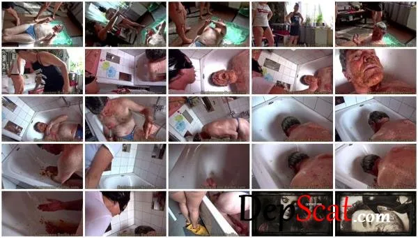The toilet slave is hit with the wooden spoon. He has to eat up all the shit and clean his face. After that he is allowed in the bathtub. As a surprise Lady Kimi still puking and spits. Even thick nasal mucus is there for the slave.