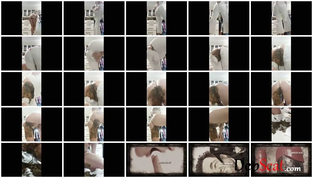 Grabbing an outfit and trying on these white jean overalls because I grabbed them so fats I ripped the buttcrack and it was so tight I couldn’t zip it up, I shit my pants so fast, It goes down my leg I bend over and zip my ass right through them its soooo hot my filthy asshole pops right out. I push out a little more, and the pants rip even more looks like you can see what i had the day before.