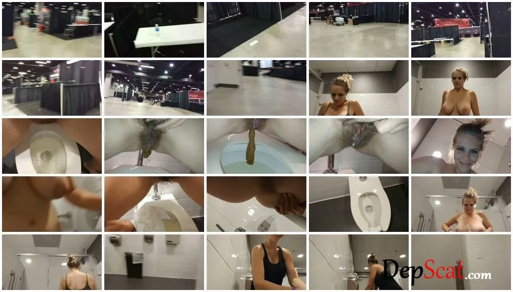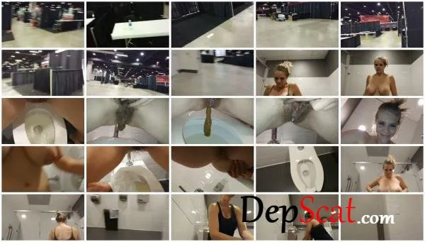 My business convention had just finished! I wanted to crawl under one of the open convention booths and piss! I look around for a bit, trying to find the best place to do this! But there are people everywhere?! I really want to do this LOL! I tell you, “We are going to fucking do this!” I continue walking around the show, with noises of others moving about, tearing down the show. I walk around and show you everything, but still hadn’t found anything. I finally decide there is too many people around and decide to just head to the restrooms. I am glad I did what I did, as at the time I didn’t even realize I had to poop also LOL! We walk into the bathroom and pick a stall. I set you down and begin taking off my clothes! My breasts and popping out of my bra, then I slowly open my bra and release them! My stomach was super swollen, which I thought was only pee. A bunch of pee floods out of me and as I bring you in close to record the last few drops, I turn on the flash and here comes a turd! I pull my pussy up with my fingers, as my pussy starts leaking cream as my ass has a giant turd hanging out of it. The long turd finally falls and my pussy is still leaking cream! I bring your face in close to give you a last view of my undercarriage! Then I grab some toilet paper and wipe off my soaked bush! Then I bring your face in really close as I wipe my ass clean. I am so use to using wet wipes, I hate using toilet paper when I poo LOL! Once I am clean, I show you as I flush the toilet. Then I set you down and start to get dressed. My huge tits bouncing around as I make silly faces at you hehe! You can hear random dryers going off and toilets flushing in the background. Then we walk out of the bathroom stall and walk over to wash my hands and then dry them. Then I pull out my tits and flash you, when anyone could walk in, and have seen me! I walk out of the restroom door and back out onto the convention floor, telling you that I got a lot of work left to do! I hope you enjoyed!