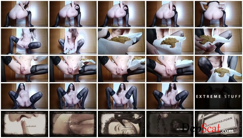 I couldn’t take it anymore! I almost didn’t get there in time to start recording with the camera and get ready! It was the first shit of the day. I’m just awake, that’s why I have that kind of weird face (not one of my best faces, sorry. I do a lot of soft and long shit, all at the same time! A really good load for a tight young girl’s ass, don’t you think? finally released it! I show the shit close to the camera and I notice that my pussy is wet with excitement, so I rub it a bit. It has white juices! then I turn around to face myself and pee until I leave a puddle on the floor. I am naked and wearing black lace stockings. They make me feel very sexy actually!